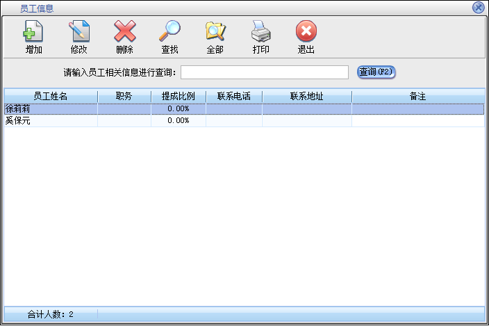 在基本设置模块中点击"员工信息"按钮打开员工信息窗口如图7。在窗口中可以看到所有的员工。点击"增加"按钮打开增加员工窗口,输入员工的信息,员工名称不能重复。点击"修改"按钮可以修改选中的员工信息。点击"删除"按钮可以删除选中的员工,如果该员工有业务发生则不能删除。点击"查找"按钮打开员工查询窗口,输入相应的条件查询不同的员工信息。点击"全部"按钮可以列出所有的员工信息。 |