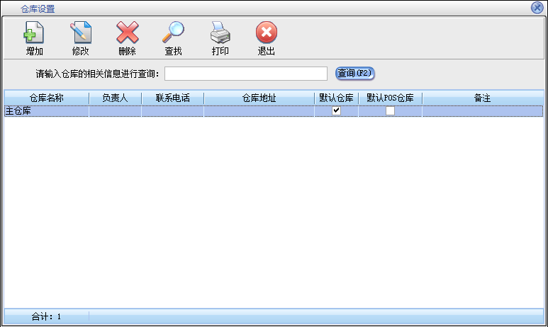 在基本设置模块中点击"仓库设置"按钮打开仓库设置窗口如图8。在窗口中可以看到所有的仓库。点击"增加"按钮打开增加仓库窗口,输入仓库的信息,仓库名称不能重复。如果选择中"默认仓库"在所有单据打开窗口的时候显示的为该仓库,默认仓库只能有一个。点击"修改"按钮可以修改选中的仓库信息。点击"删除"按钮可以删除选中的仓库,如果该仓库有业务发生则不能删除。点击"查找"按钮打开仓库查询窗口,输入相应的条件查询不同的仓库信息。点击"全部"按钮可以列出所有的仓库信息。