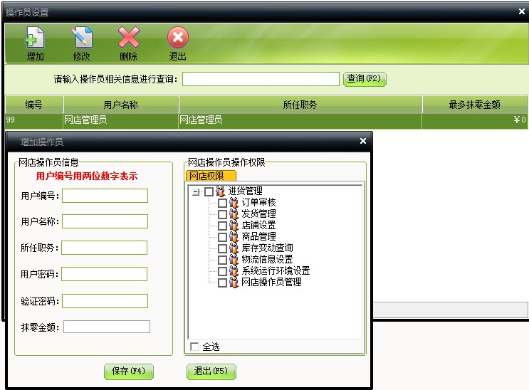 在“操作员设置”中添加收银员,勾选下面的“POS收银员”或“POS柜长”进行收银员或柜长权限的设置,设置成收银员后,该操作员不能再操作后台;设为柜长后,在前台可以对出入款和退货进行柜长授权。